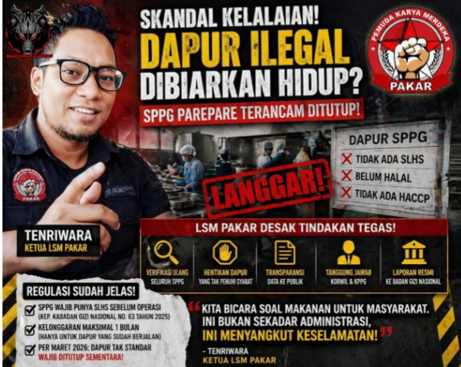 LSM PAKAR mengungkap temuan mencengangkan: sejumlah dapur masih beroperasi tanpa memenuhi standar dasar yang diwajibkan oleh negara.