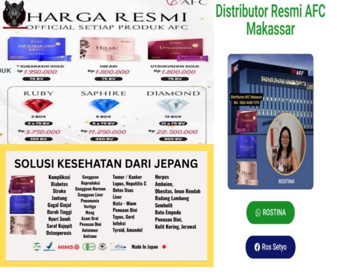 Menjawab kebutuhan tersebut, Rostina, selaku Distributor Resmi AFC Makassar, aktif menghadirkan produk nutrisi AFC (Advanced Functional Food) sekaligus memberikan edukasi kepada masyarakat tentang pentingnya nutrisi sebagai bagian dari gaya hidup sehat.