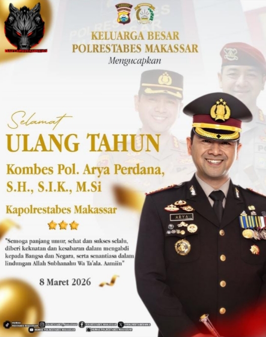 Makassar || Daftar Hitam News.Id — Kapolrestabes Makassar, Arya Perdana, genap bertambah usia pada Sabtu, 8 Maret 2026. Tepat pukul 00.00 WITA, berbagai ucapan selamat dan doa mulai mengalir kepada orang nomor satu di jajaran Polrestabes Makassar tersebut. Sabtu,8 Maret 2026.
