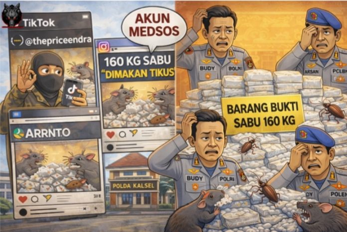 Makassar || Daftar Hitam News.Id — Jagat media sosial kembali dihebohkan dengan beredarnya narasi yang menyebut barang bukti sabu seberat 160 kilogram hilang karena “dimakan tikus dan kecoak”. Klaim tersebut muncul dalam sejumlah unggahan, termasuk video dari akun @manusia.bertopeng24 yang menyampaikan pernyataan bernada satire.