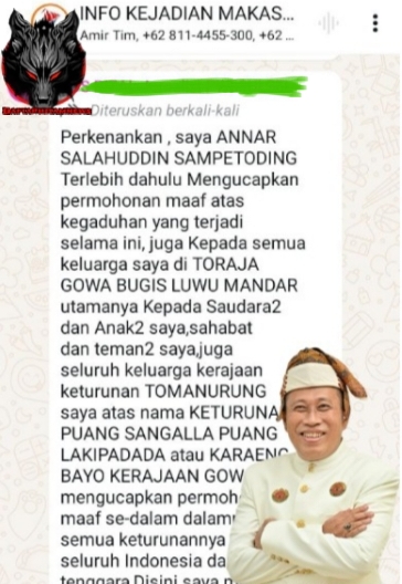 Terlebih dahulu Mengucapkan permohonan maaf atas kegaduhan yang terjadi selama ini, juga Kepada semua keluarga saya di TORAJA GOWA BUGIS LUWU MANDAR utamanya Kepada Saudara2 dan Anak2 saya,sahabat dan teman2 saya,juga seluruh keluarga kerajaan keturunan TOMANURUNG saya atas nama KETURUNAN PUANG SANGALLA PUANG LAKIPADADA atau KARAENG BAYO KERAJAAN GOWA mengucapkan permohonan maaf se-dalam dalamnya.untuk semua keturunannya di seluruh Indonesia dan Asia tenggara,Disini saya merasa perlu menyampaikan bahwasanya, Perbuatan yang dituduhkan kepada saya melalui media online, media elektronik,media cetak dan media sosial pada umumnya adalah perbuatan yang dianggap melanggar hukum yaitu: